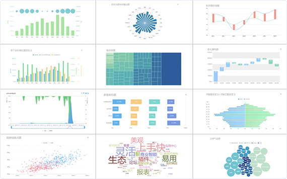 • 數(shù)十種的可視化圖表效果,包括柱形圖、折線圖、雷達(dá)圖、散點(diǎn)圖和詞云圖等,滿足不同人群的閱讀偏好,為您展示多樣數(shù)據(jù)信息提供全面支持
